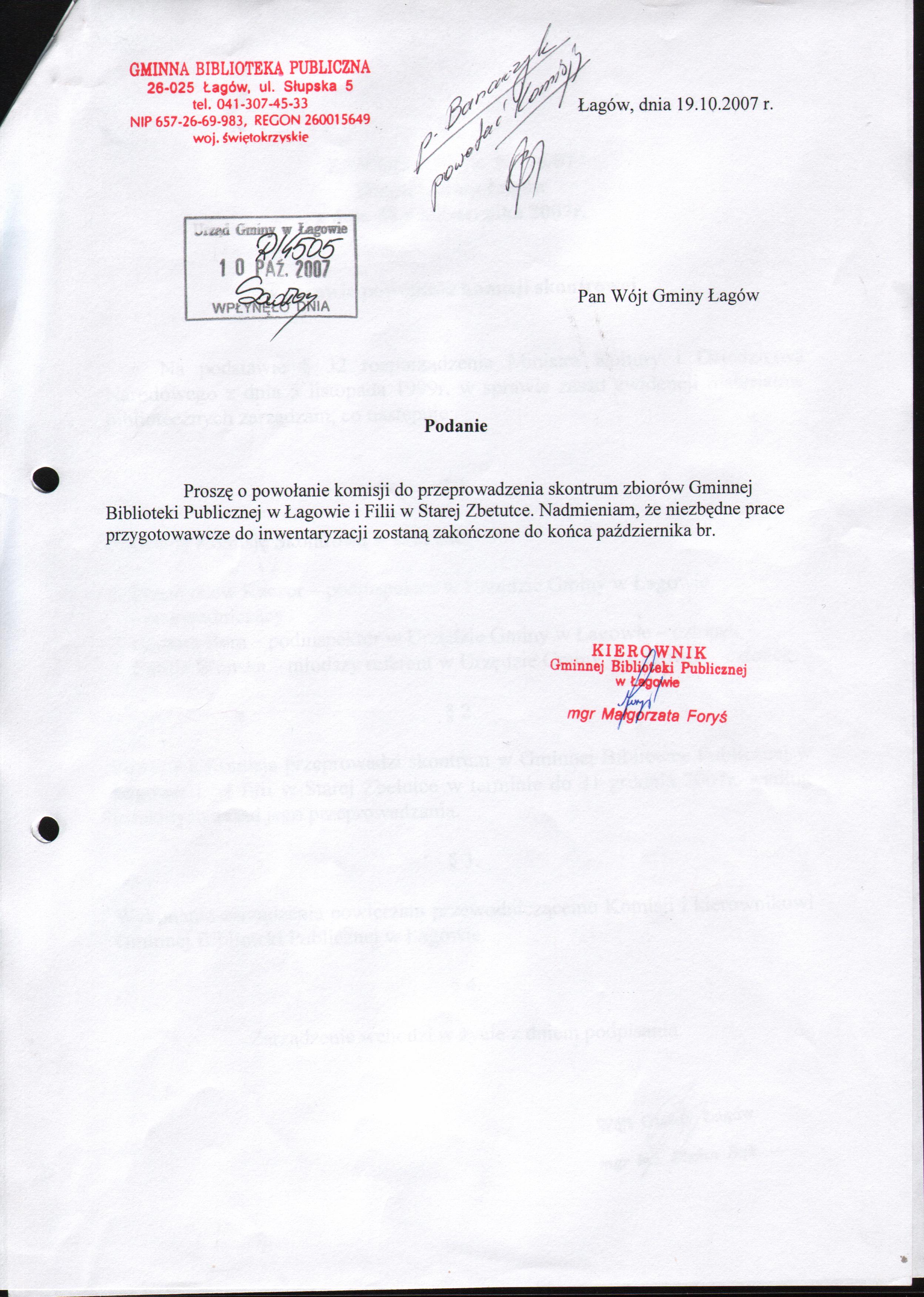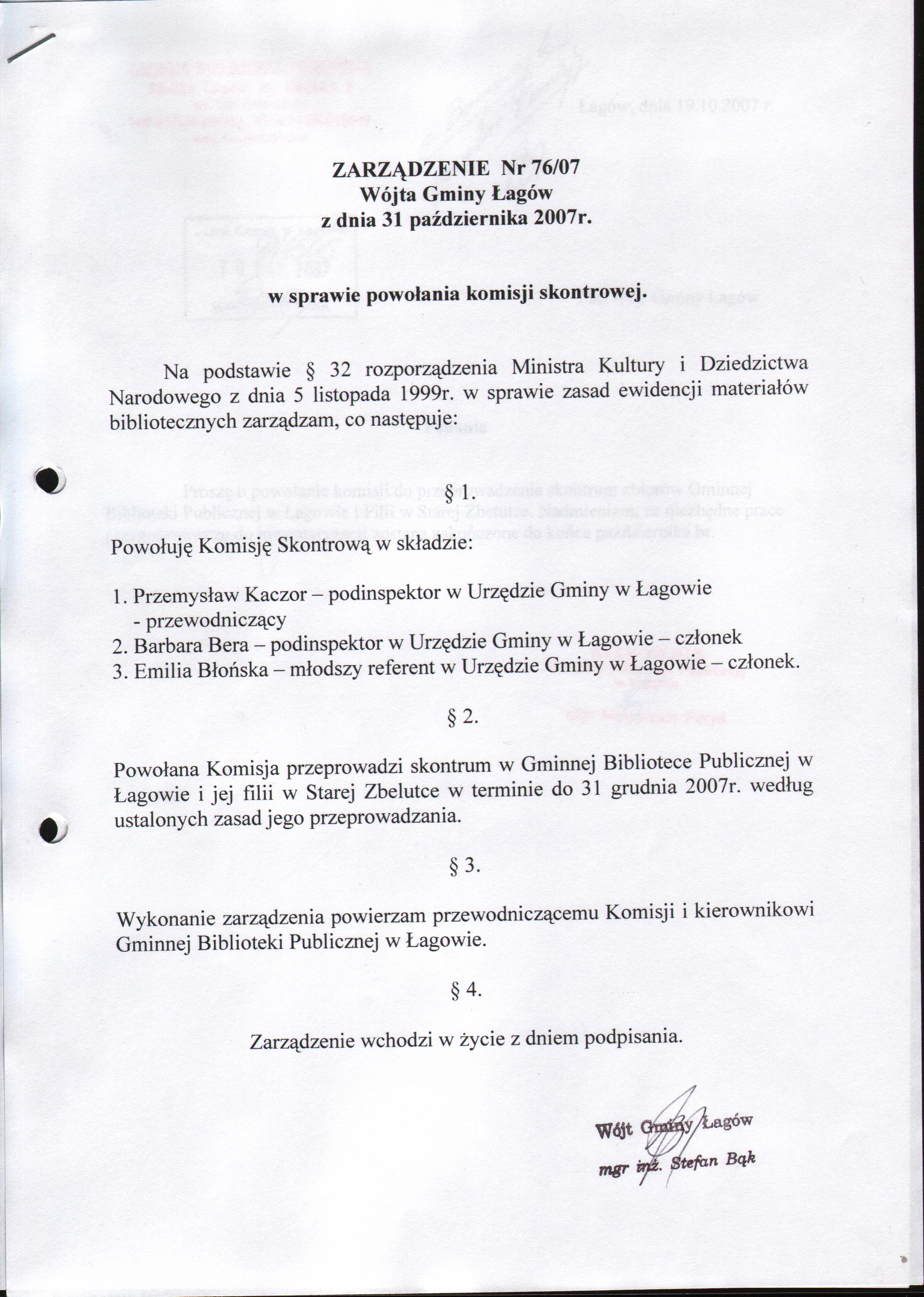 | Zarządzenie nr 76/07 Wójta Gminy Łagów z dn. 31 października 2007 r. w sprawie powołania komisji skontrowej. | 2008-08-27 |