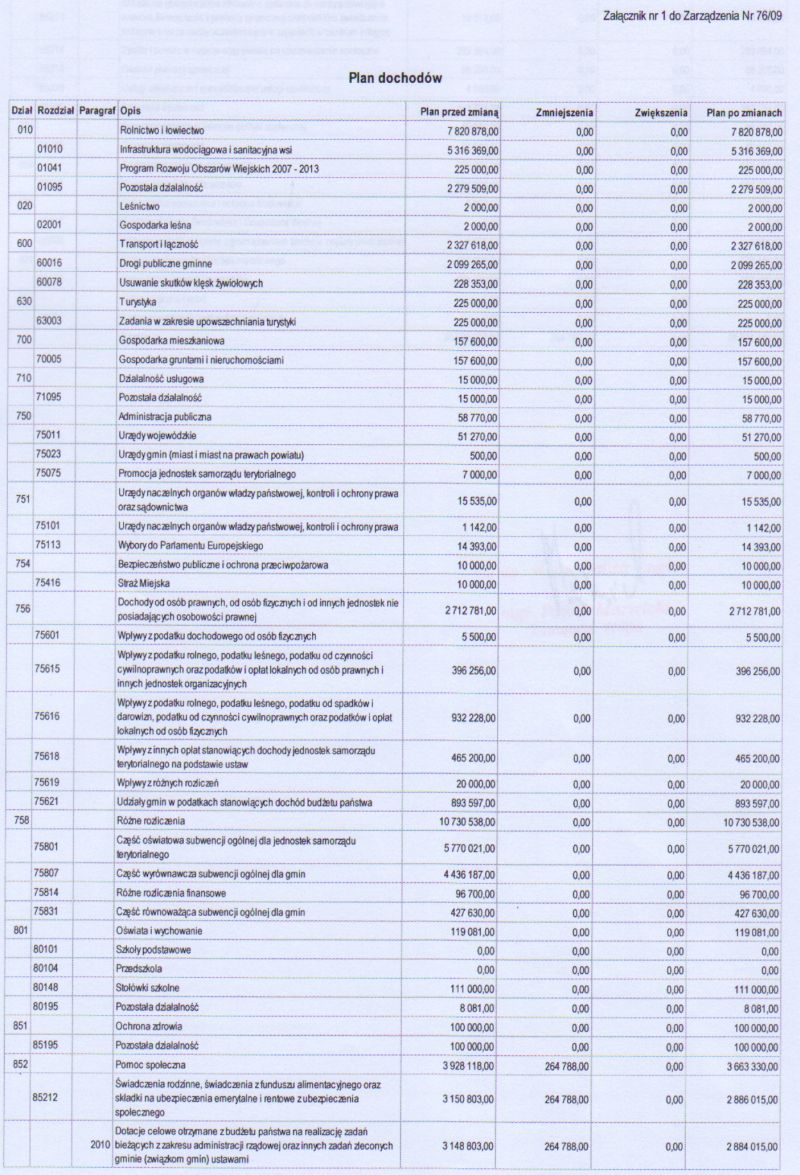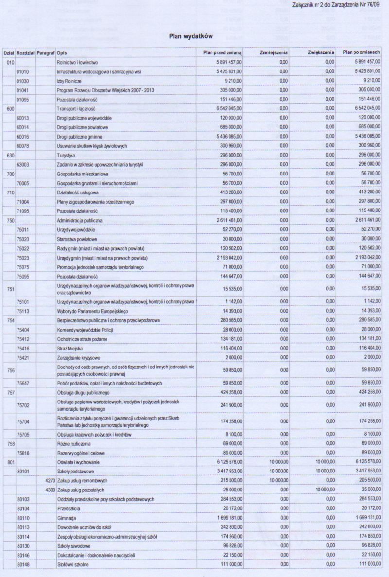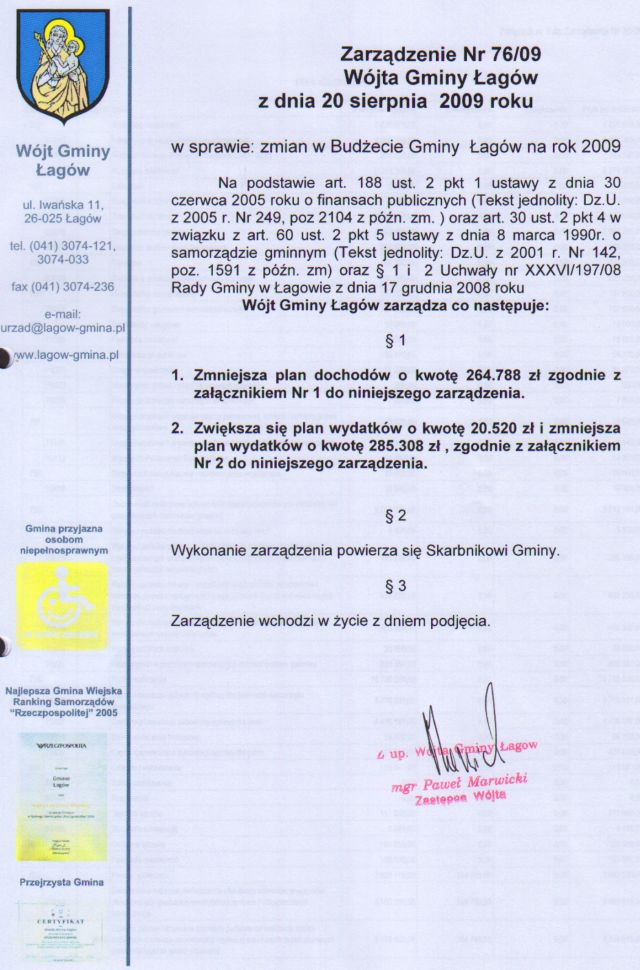 | Zarządzenie nr 76/09 Wójta Gminy Łagów z dnia 20 sierpnia 2009 r. w sprawie zmian w budżecie gminy Łagów na rok 2009 | 2009-10-09 |