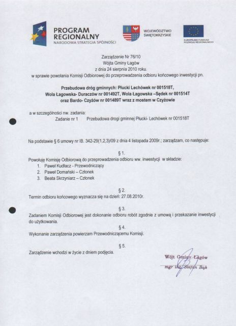 | Zarządzenie Nr 76/10 Wójta Gminy Łagów z dnia 04 sierpnia 2010 roku w sprawie powołania Komisji Odbiorowej do przeprowadzenia odbioru końcowego inwestycji pn. "Przebudowa dróg gminnych" | 2010-09-13 |