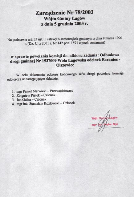 | Zarządzenie nr 78/03 Wójta Gminy Łagów z dn. 5 grudnia 2003 r. w sprawie powołania komisji do odbioru zadania: Odbudowa drogi gminnej nr 1537009 Wola Łagowska odcinek Baraniec - Olszowiec. | 2008-10-23 |