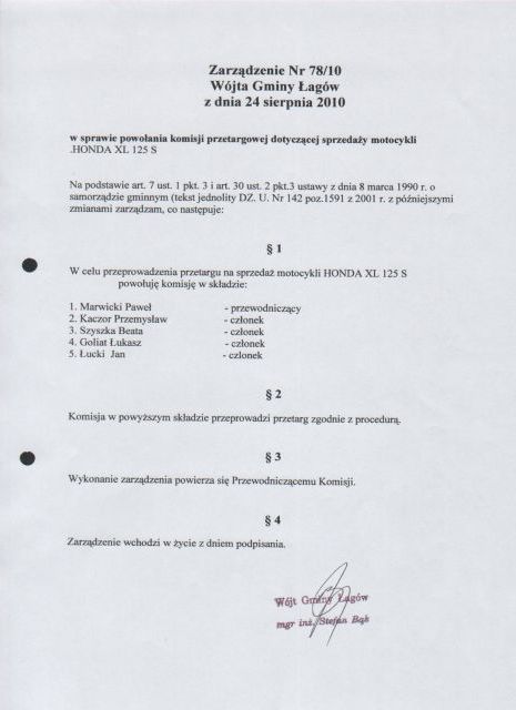 | Zarządzenie Nr 78/10 Wójta Gminy Łagów z dnia 24 sierpnia 2010 r. w sprawie powołania komisji przetargowej dotyczącej sprzedaży motocykli HONDA XL 125 S | 2010-09-13 |