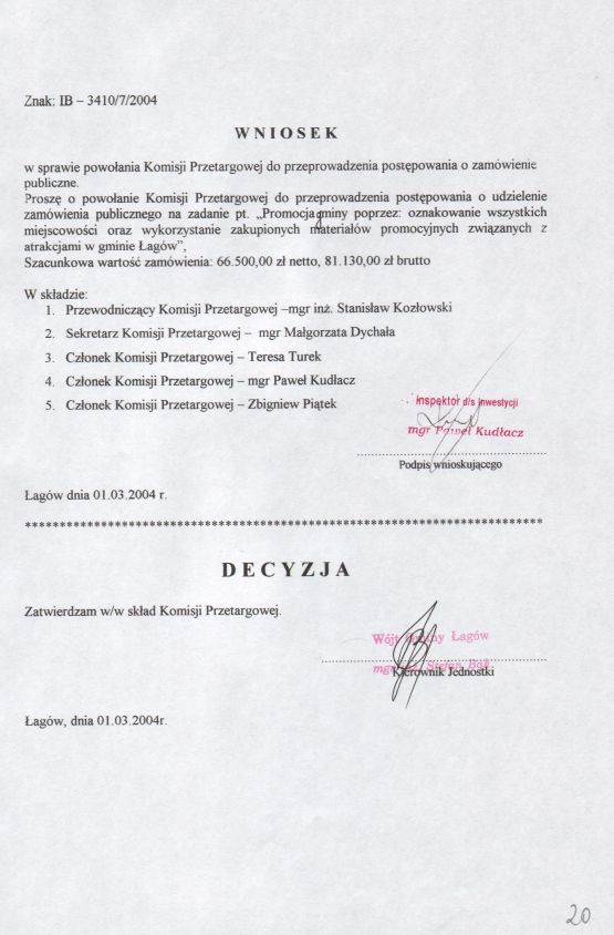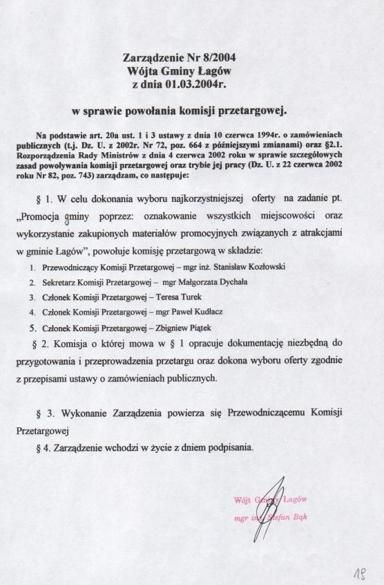 | Zarządzenie nr 8/04 Wójta Gminy Łagów z dn. 1 marca 2004 r. w sprawie powołania komisji przetargowej. | 2008-10-22 |