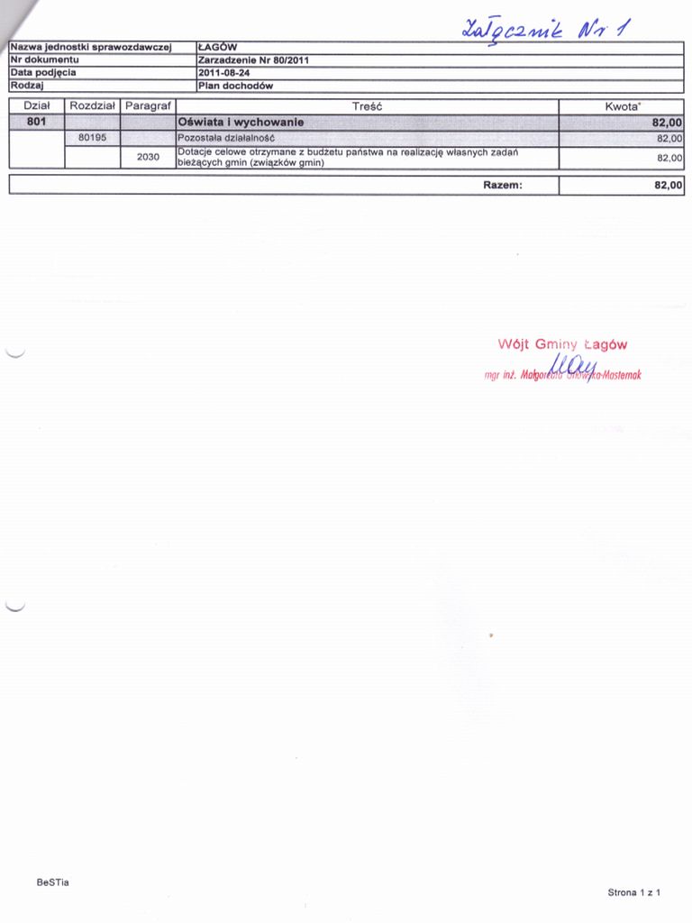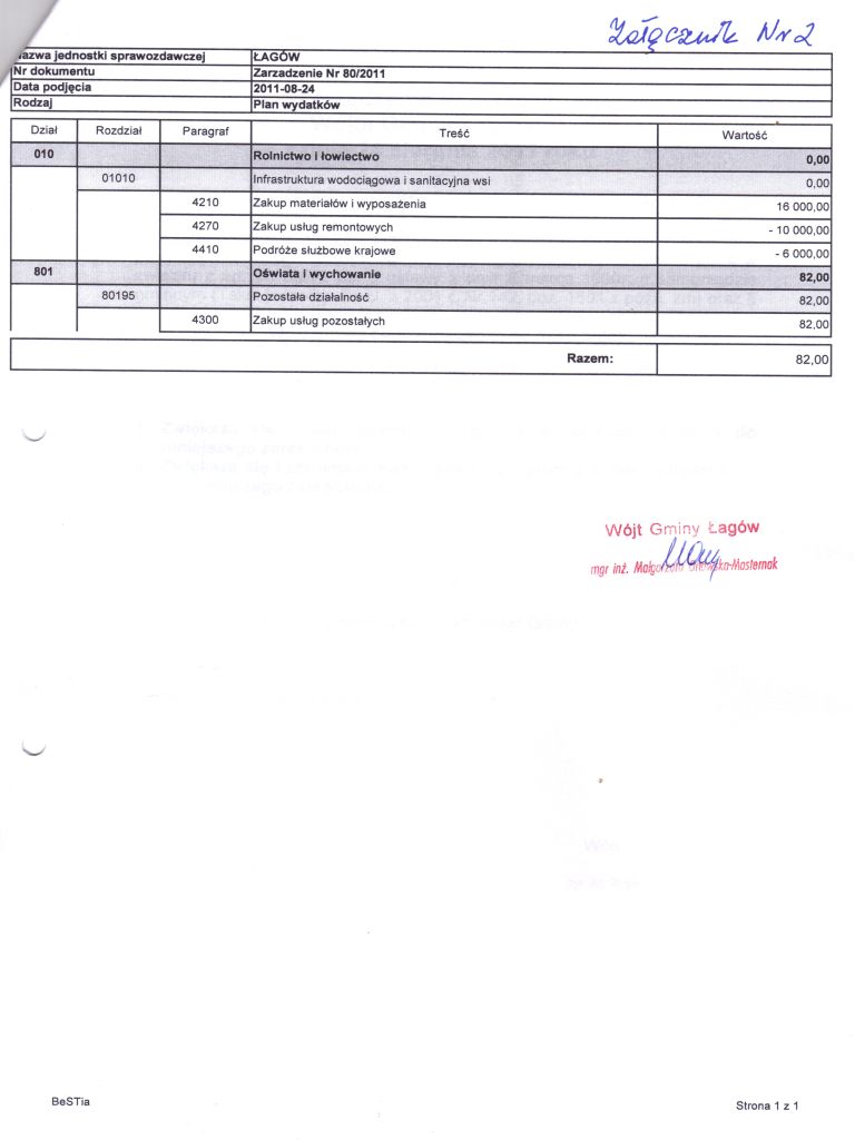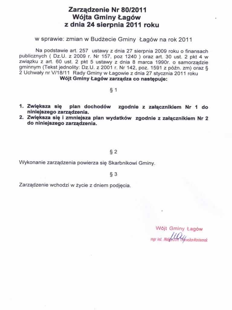 | Zarządzenie Nr 80/2011 Wójta Gminy Łagów z dnia 24 sierpnia 2011 roku w sprawie: zmian w Budżecie Gminy Łagów na rok 2011 | 2012-10-03 |