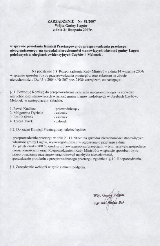 | Zarządzenie nr 81/07 Wójta Gminy Łagów z dn. 21 listopda 2007 r. w sprawie powołania komisji przetargowej | 2008-09-16 |