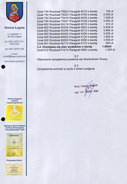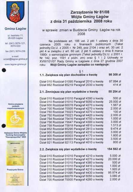 | Zarządzenie Nr 81/08 Wójta Gminy Łagów z dn. 31 października 2008r. w sprawie zmian w Budżecie Gminy Łagów na rok 2008 | 2009-01-02 |