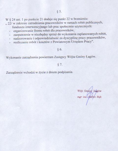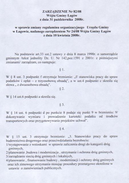 | Zarządzenie Nr 82/08 Wójta Gminy Łagów z dn. 31 października 2008r. w sprawie zmiany regulaminu organizacyjnego Urzedu Gminy w Łagowie, nadanego zarządzeniem nr 24/08 Wójta Gminy Łagów z dnia 10 kwietnia 2008r. | 2009-01-02 |