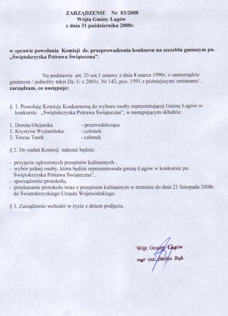 | Zarządzenie Nr 83/08 Wójta Gminy Łagów z dn. 31 października 2008r. w sprawie powołania Komisji ds. przeprowadzenia konkursu na szczeblu gminnym pn. "świętkorzyska Potrawa świąteczna" | 2009-01-02 |