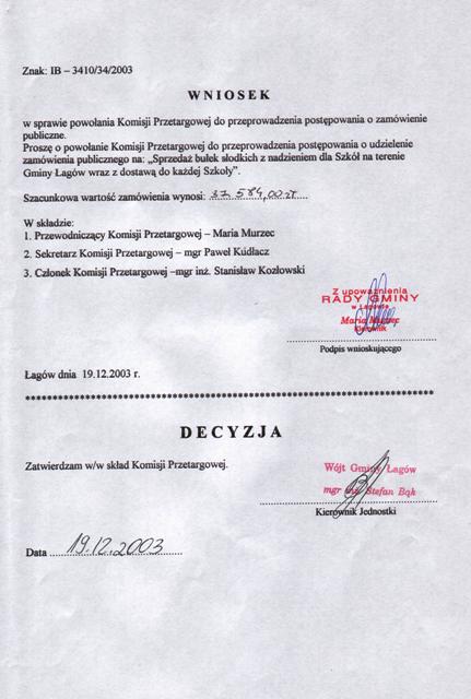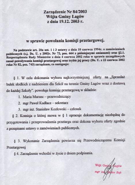 | Zarządzenie nr 84/03 Wójta Gminy Łagów z dn. 19 grudnia 2003 r. w sprawie powołania komisji przetargowej. | 2008-10-23 |