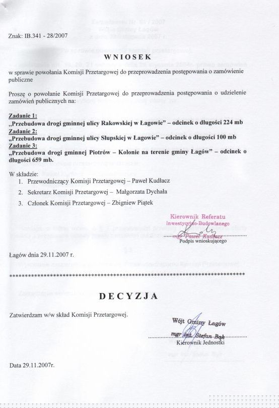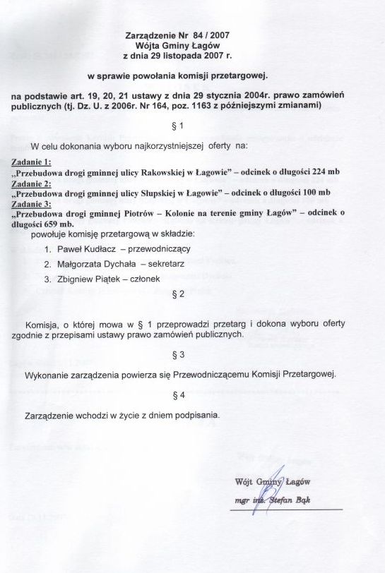 | Zarządzenie nr 84/2007 Wójta Gminy Łagów z dn. 29 listopada 2007 r. w sprawie powołania komisji przetargowej. | 2008-09-26 |