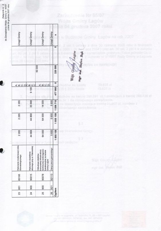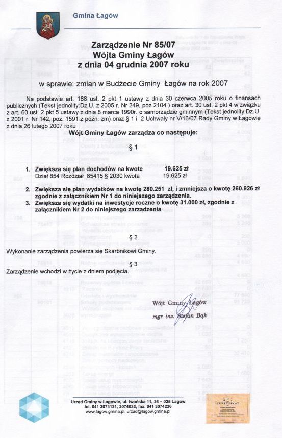 | Zarządzenie nr 85/07 Wójta Gminy Łagów z dn. 4 grudzień 2007 r. w sprawie zmian w Budżecie Gminy Łagów na rok 2007. | 2008-09-26 |