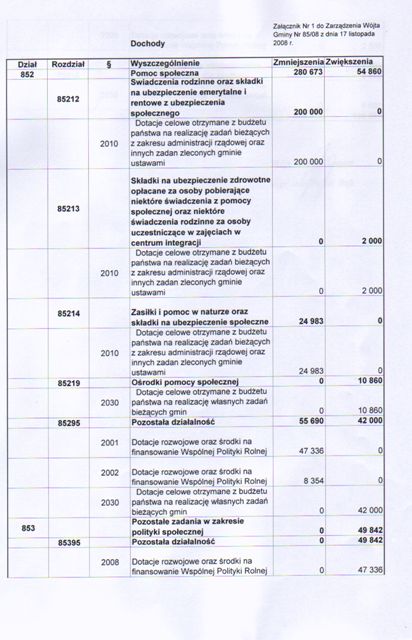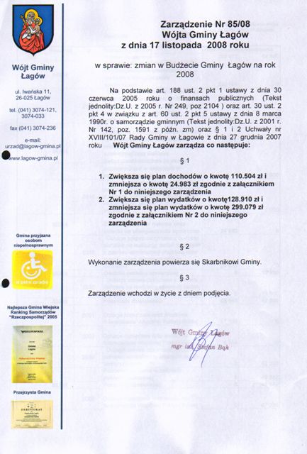 | Zarządzenie Nr 85/08 Wójta Gminy Łagów z dn. 17 listopada 2008 r. w sprawie zmian w budżecie Gminy Łagów na rok 2008. | 2009-01-05 |