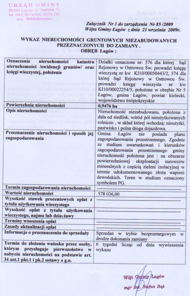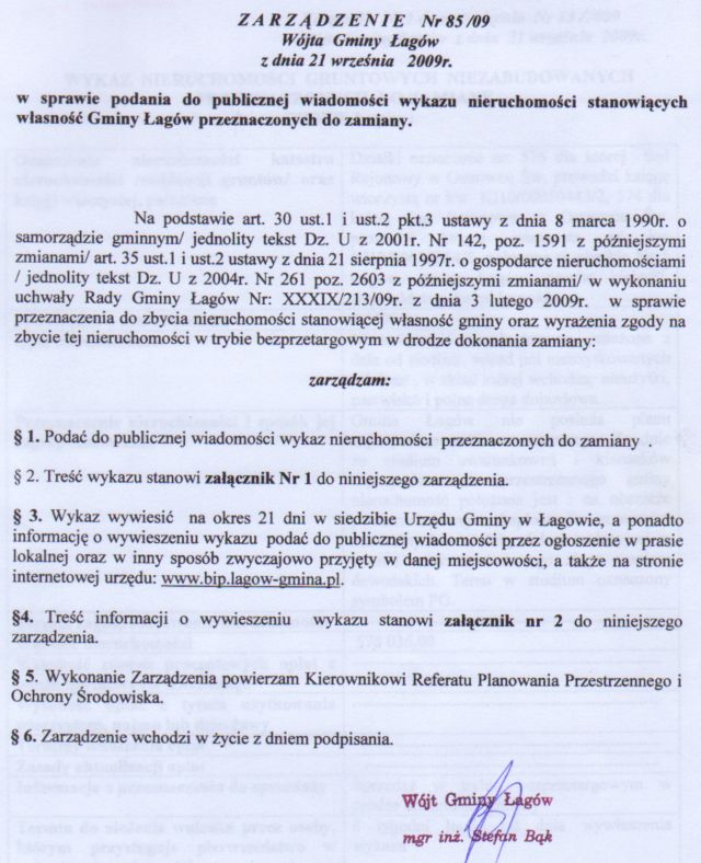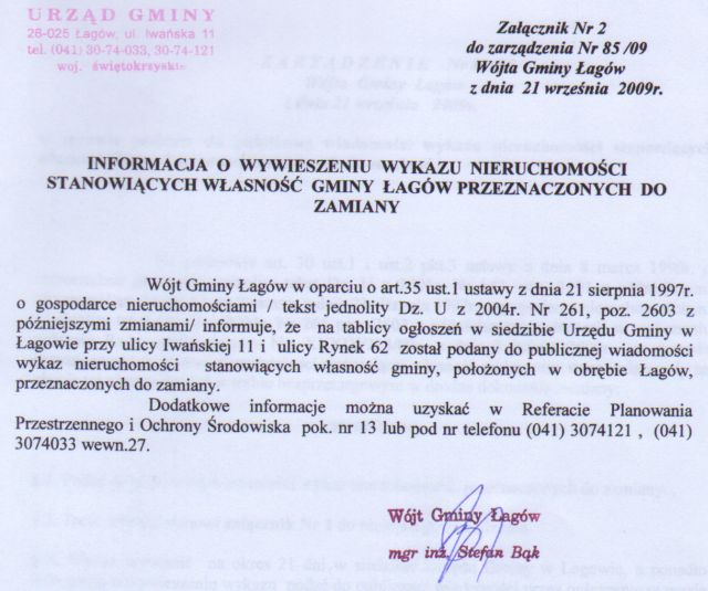 | Zarządzenie nr 85/09 Wójta Gminy Łagów z dnia 21 września 2009 r. w sprawie podania do publicznej wiadomośći wykazu nieruchomości stanowiących własność gminy Łagów przeznaczonych do zamiany | 2009-10-09 |