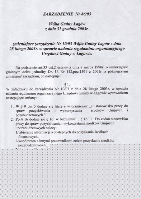 | Zarządzenie nr 86/03 Wójta Gminy Łagów z dn. 31 grudnia 2003 r. zmieniające zarządzenie nr 10/03 Wójta Gminy Łagów z dnia 28 lutego 2003 r. w sprawie nadania regulminu organizacyjnego Urzędowi Gminy w Łagowie. | 2008-10-23 |