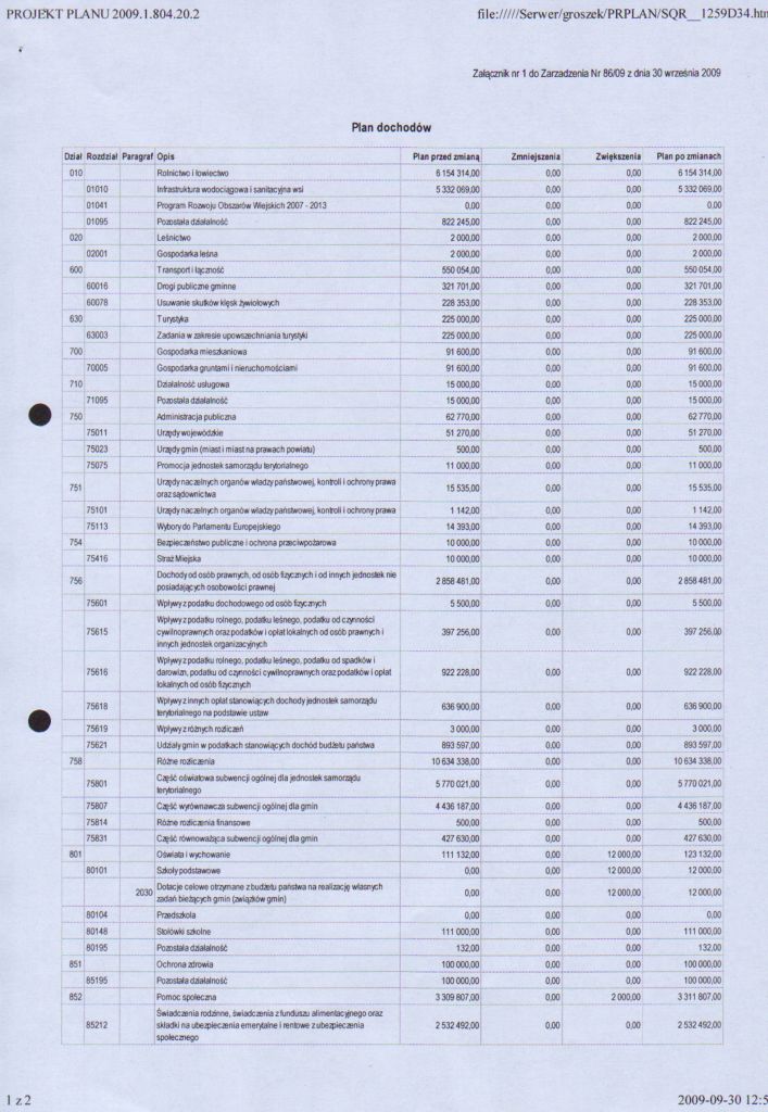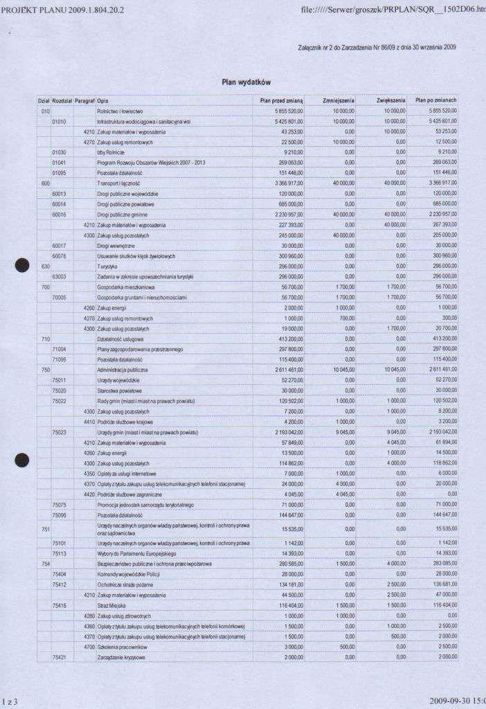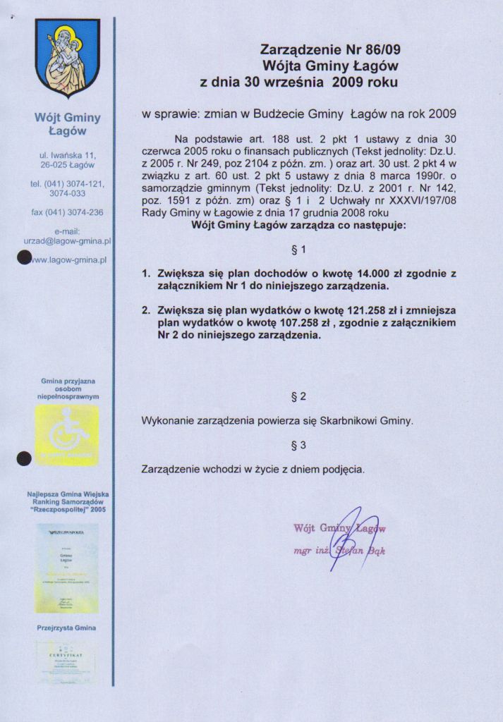 | Zarządzenie nr 86/09 Wójta Gminy Łagów z dnia 30 września 2009 r. w sprawie zmian w budżecie gminy Łagów na rok 2009 | 2009-11-10 |