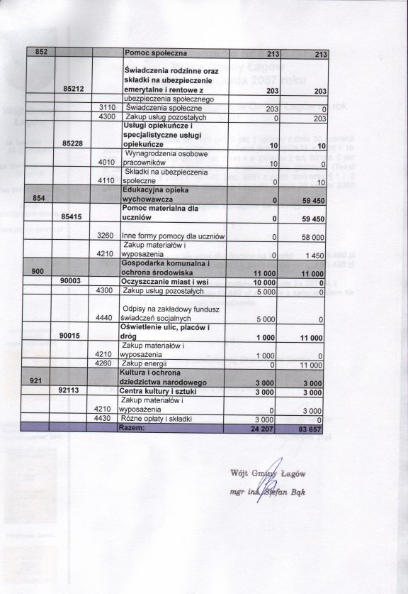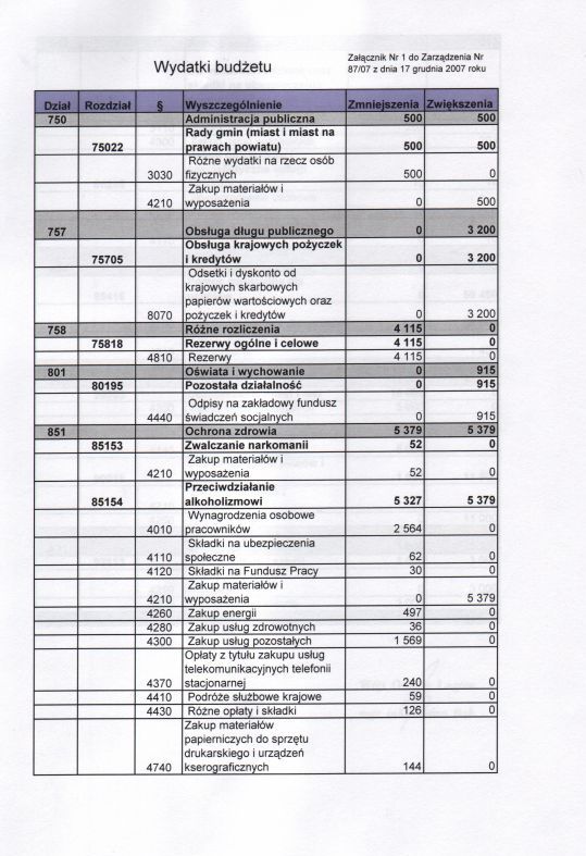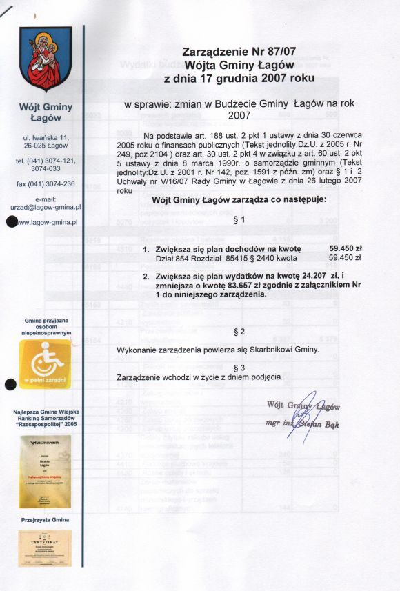 | Zarządzenie nr 87/07 Wójta Gminy Łagów z dn. 17 grudnia 2007 r. w sprawie: zmian w Budżecie Gminy Łagów na rok 2007. | 2008-09-26 |