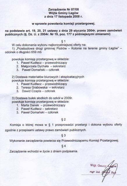 | Zarządzenie Nr 87/08 Wójta Gminy Łagów z dn. 17 listopada 2008 r. w sprawie powołania komisji przetargowej. | 2009-01-05 |