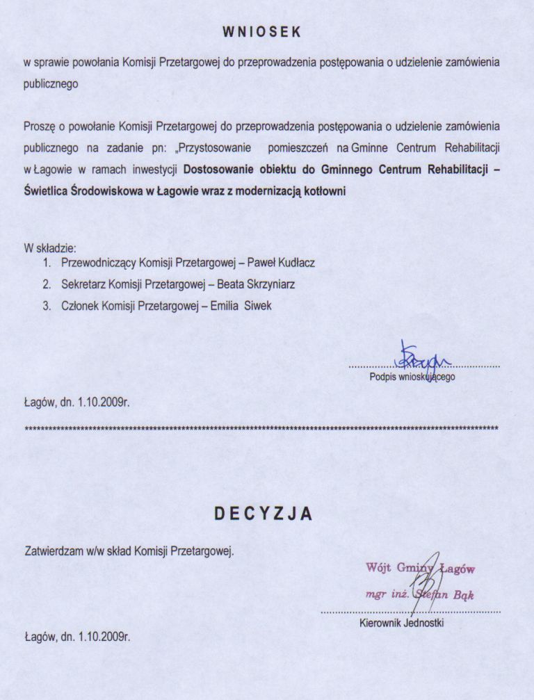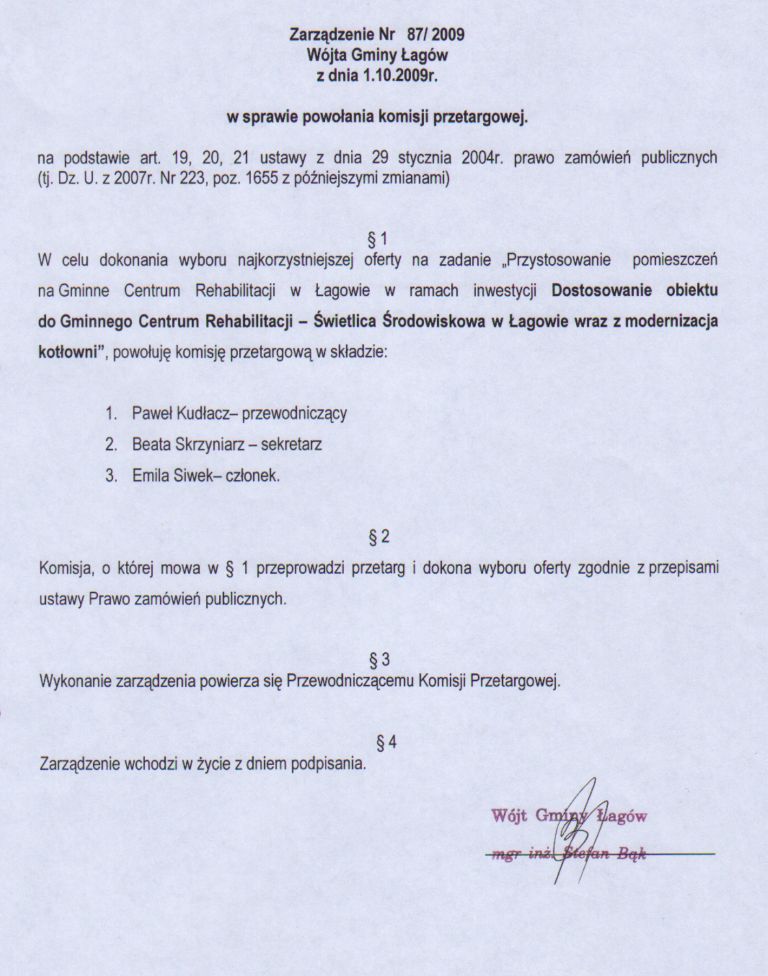 | Zarządzenie nr 87/09 Wójta gminy Łagów z dnia 1 października 2009 r. w sprawie powołania komisji przetargowej | 2009-11-10 |