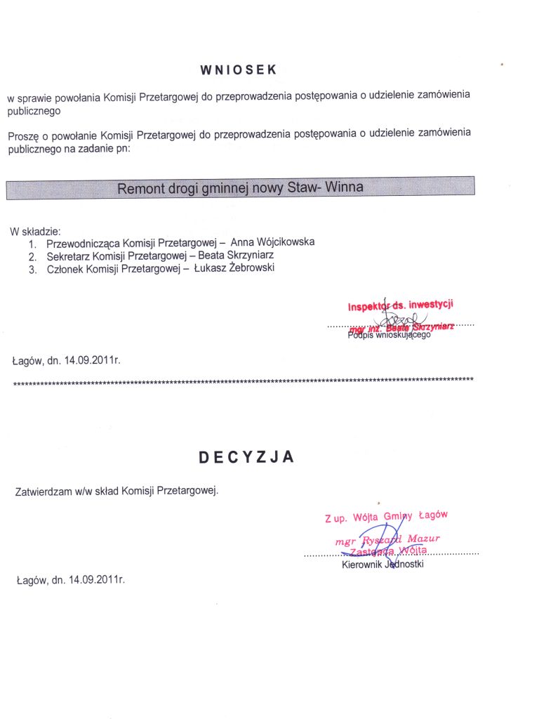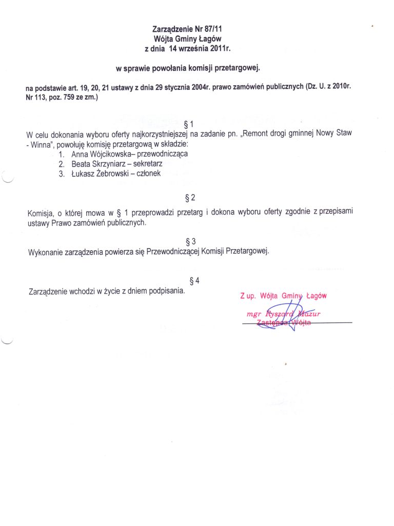 | Zarządzenie Nr 87/11 Wójta Gminy Łagów z dnia 14 września 2011 r. w sprawie powołania komisji przetargowej | 2012-10-03 |