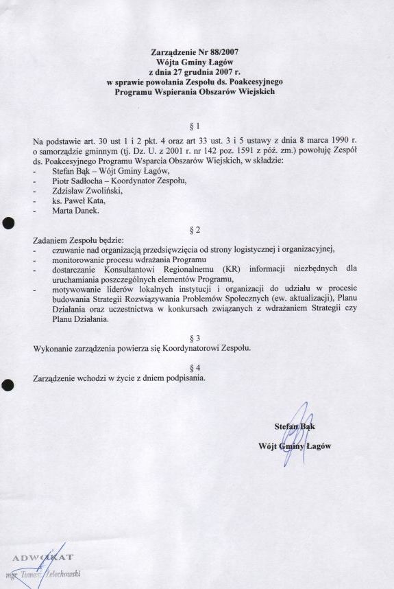 | Zarządzenie nr 88/2007 Wójta Gminy Łagów z dn. 27 grudnia 2007 r. w sprawie powołania Zespołu ds. Poakcesyjnego Programu Wspierania Obszarów Wiejskich. | 2008-09-26 |