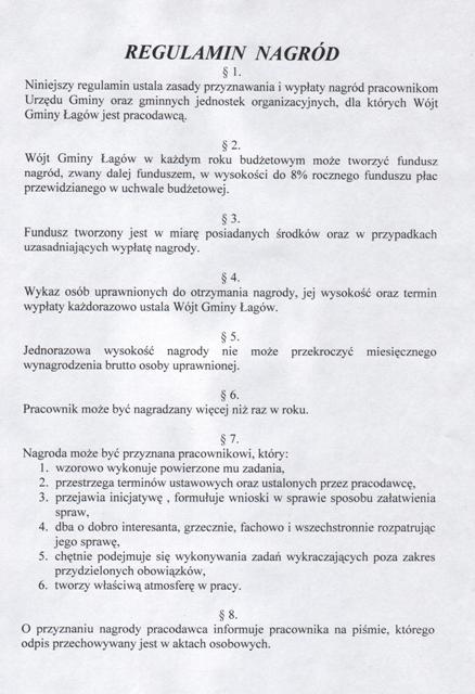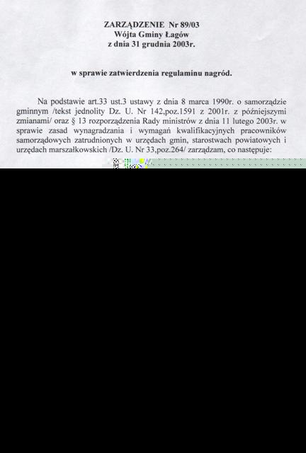 | Zarządzenie nr 89/03 Wójta Gminy Łagów z dn. 31 grudnia 2003 r. w sprawie zatwierdzenia regulaminu nagród. | 2008-10-23 |