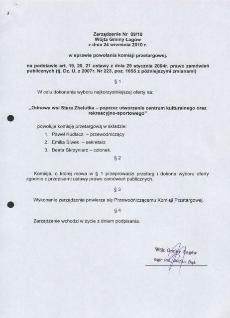 | Zarządzenie Nr 89/10 Wójta Gminy Łagów z dn. 24 września 2010 r. w sprawie powołania komisji przetargowej | 2010-10-21 |
