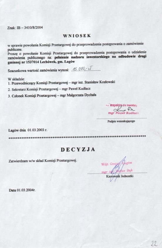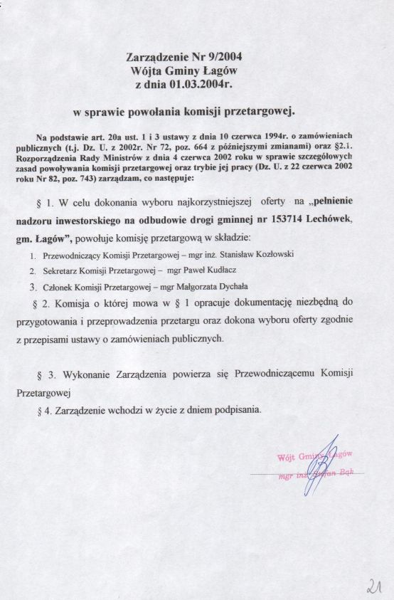 | Zarządzenie nr 9/04 Wójt Gminy Łagów z dn. 1 marca 2004 r. w sprawie powołania komisji przetargowej. | 2008-10-22 |