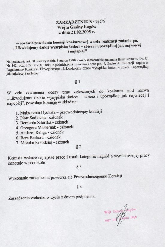 | Zarządzenie nr 9/05 Wójta Gminy Łagów z dn. 21 lutego 2005 r. w sprawie powołania komisji konkursowej w celu realizacji zadania pn. „Likwidujemy dzikie wysypiska śmieci - zbierz i uporządkuj jak najwięcej i najlepiej”. | 2008-10-17 |