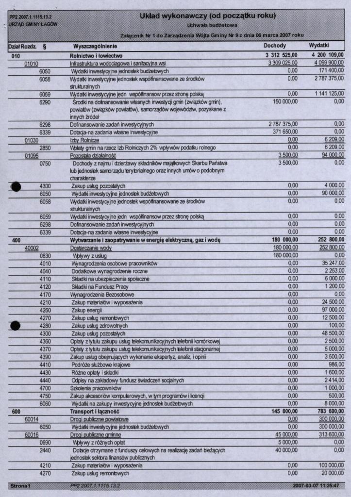 | Zarządzenie nr 9/07 Wójta Gminy Łagów z dn. 6 marca 2007 r. w sprawie Układu Wykonawczego Budżetu Gminy Łagów na 2007 r. | 2008-08-25 |