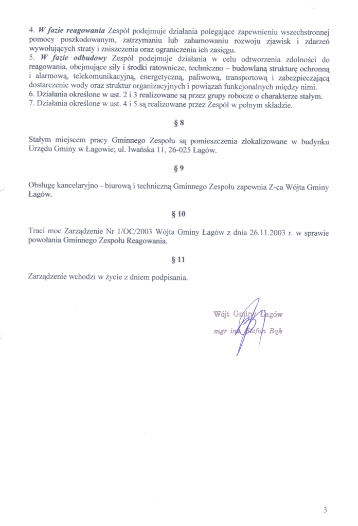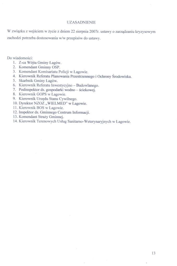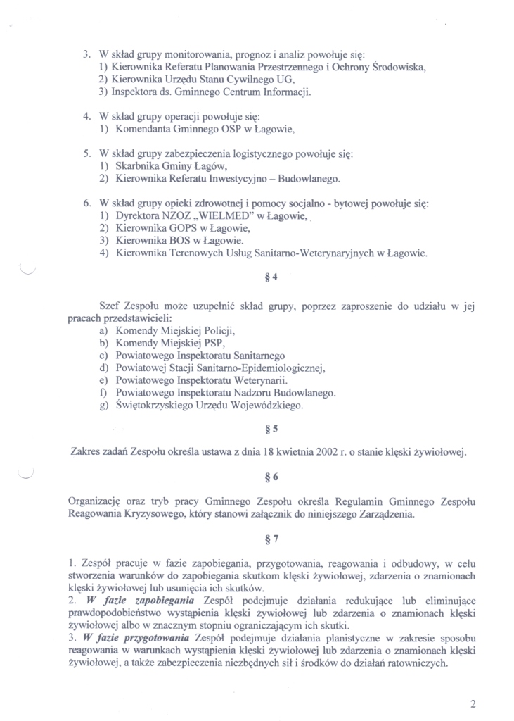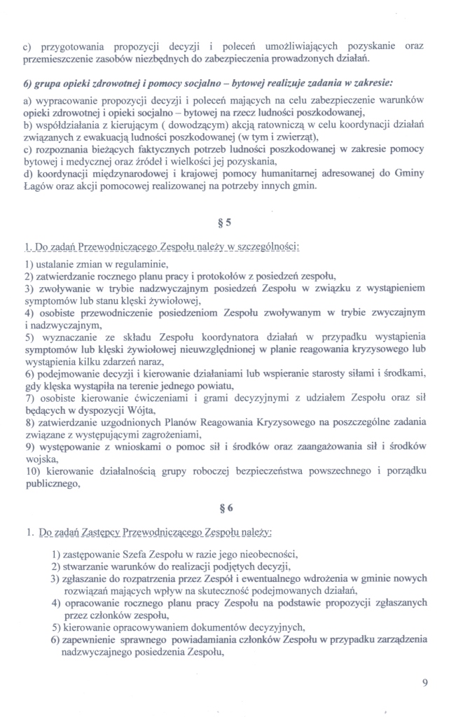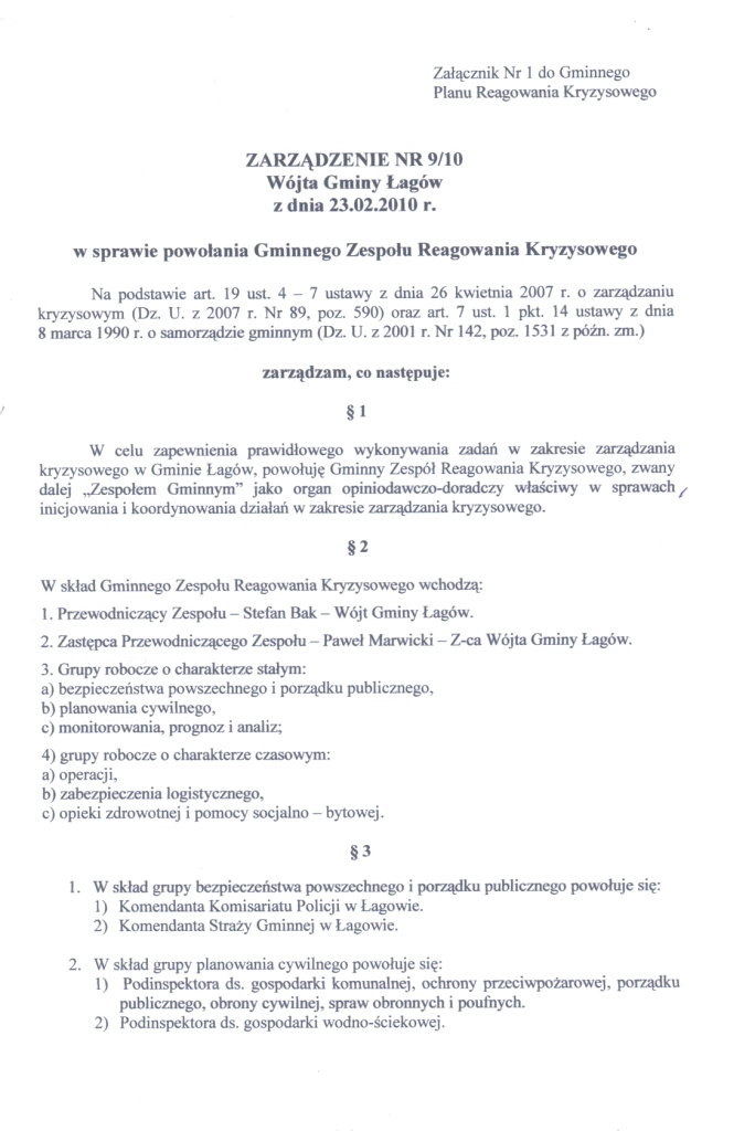 | Zarządzenie Nr 9/10 Wójta Gminy Łagów z dnia 23.02.2010 roku w sprawie powołania Gminnego Zespołu Reagowania Kryzysowego | 2010-05-14 |