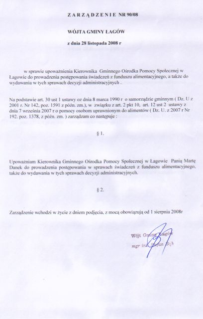 | Zarządzenie Nr 90/08 Wójta Gminy Łagów z dn. 28 listopada 2008 r. w sprawie upoważnienia Kierownika Gminnego Ośrodka Pomocy Społecznej w Łagowie do prowadzenia postępowania świadczeń z funduszu alimentacyjnego. | 2009-01-05 |