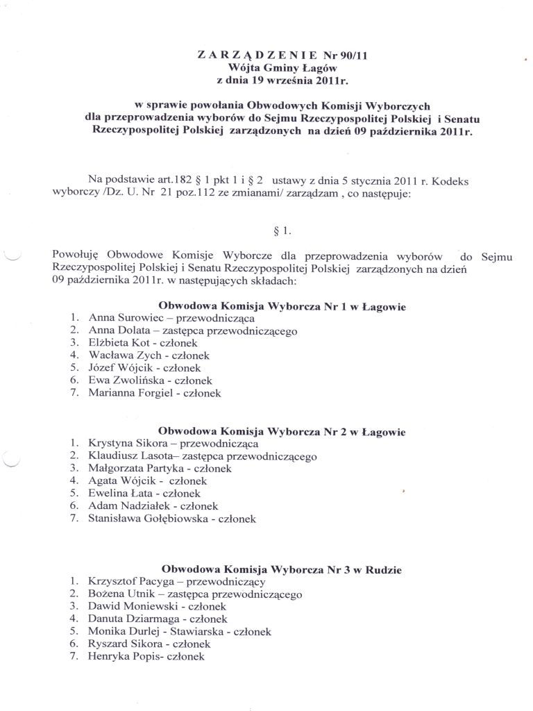 | Zarządzenie Nr 90/11 Wójta Gminy Łagów z dnia 19 września 2011 r. w sprawie powołania Obwodowych Komisji Wyborczych dla przeprowadzenia wyborów so Sejmu RP i Senatu RP zarządzonych na dzień 09 października 2011 r. | 2012-10-03 |