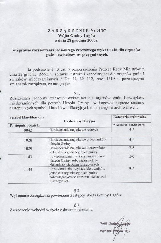 | Zarządzenie nr 91/07 Wójta Gminy Łagów z dn. 28 grudnia 2007 r. w sprawie rozszerzenia jednolitego rzeczowego wykazu akt dla organów gmin i związków międzygminnych. | 2008-09-26 |