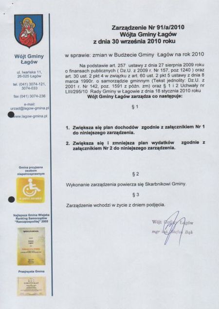 | Zarządzenie Nr 91/a/2010 Wójta Gminy Łagów z dn. 30 września 2010 r. w sprawie : zmian w Budżecie Gminy Łagów na rok 2010 | 2010-10-21 |