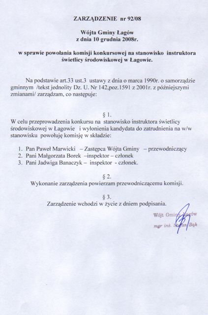 | Zarządzenie Nr 92/08 Wójta Gminy Łagów z dn. 10 grudnia 2008 r. w sprawie powołania komisji konkursowej na stanowisko instruktora świetlicy środowiskowej w Łagowie. | 2009-01-05 |