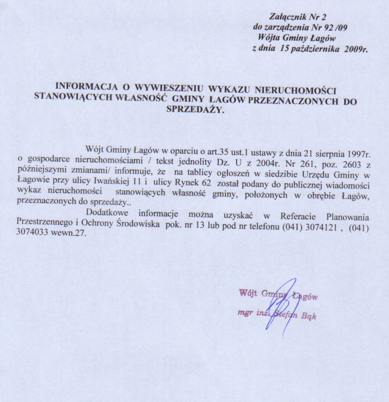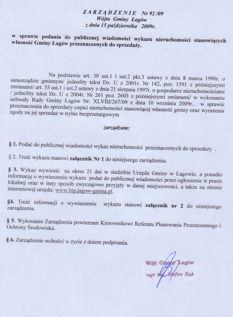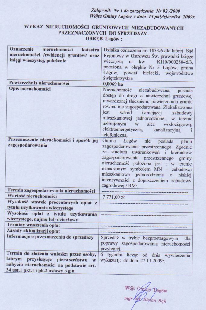 | Zarządzenie nr 92/09 Wójta Gminy Łagów z dnia 15 października 2009 r. w sprawie podania do publicznej wiadomośći wykazu nieruchomości stanowiących własność Gminy Łagów przeznaczonych do sprzedaży | 2009-11-10 |