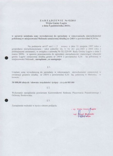 | Zarządzenie Nr 92/10 Wójta Gminy Łagów z dnia 5.10.2010 r. w sprawie ustalenia ceny wywoławczej do sprzedaży w rokowanich, nieruchomości położonej w miejscowości Melonek oznaczonej działką nr 240/04 o pow. 0,34 ha | 2010-10-21 |