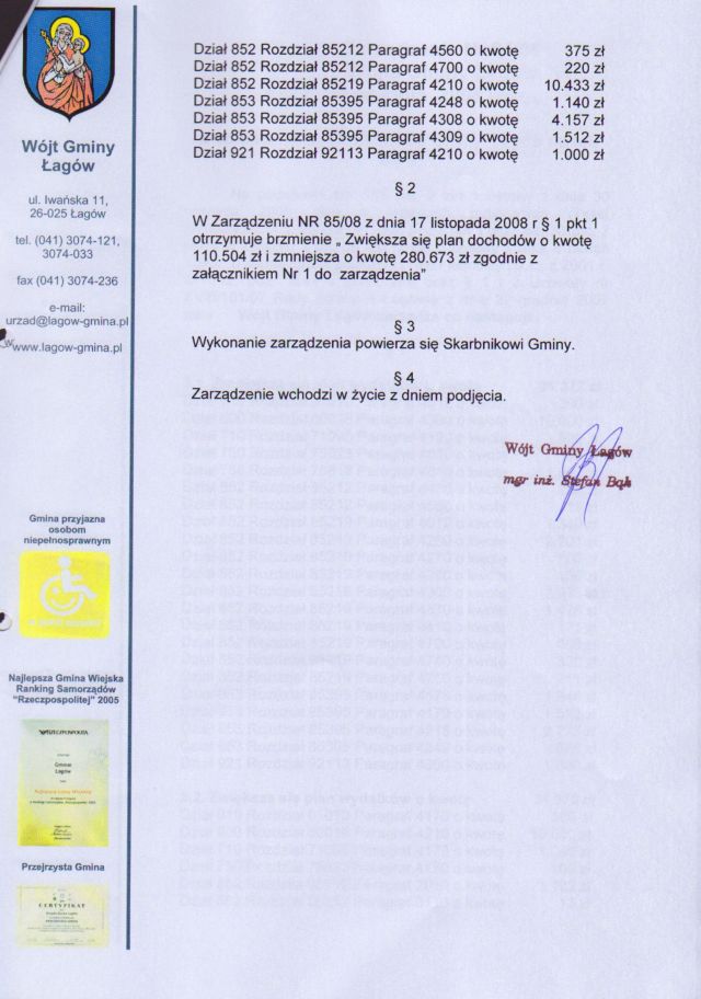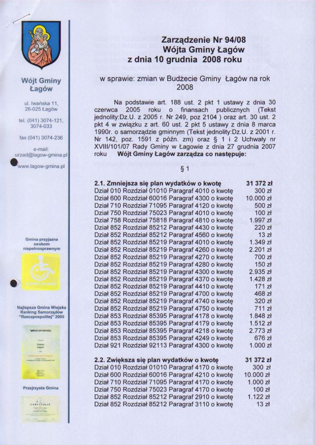 | Zarządzenie Nr 94/08 Wójta Gminy Łagów z dn. 10 grudnia 2008 r. w sprawie zmian w Budżecie Gminy Łagów na rok 2008. | 2009-02-03 |