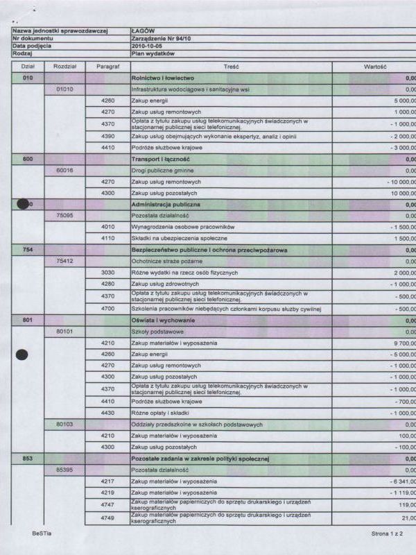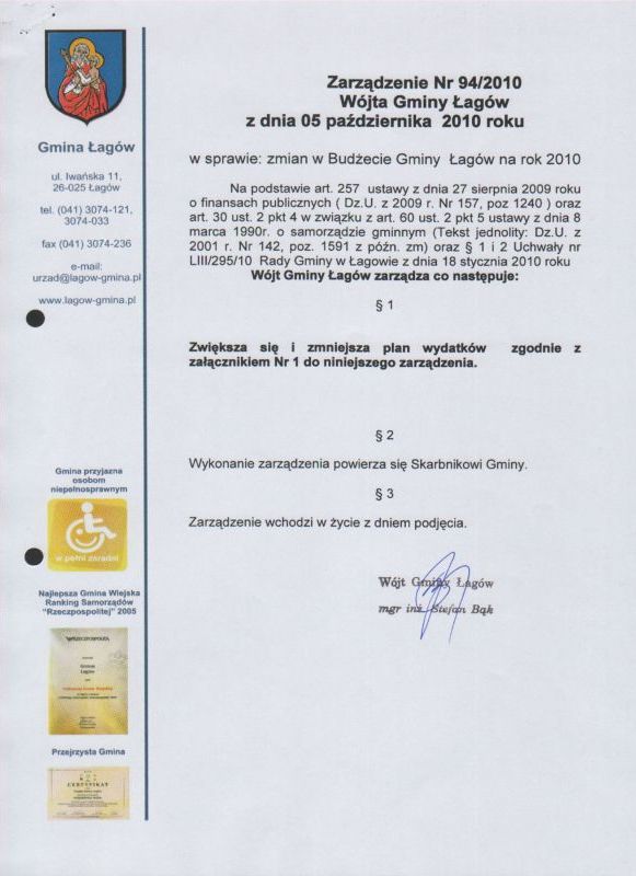 | Zarządzenie Nr 94/2010 Wójta Gminy Łagów z dnia 05 października 2010 roku w sprawie: zmian w Budżecie Gminy Łagów na rok 2010 | 2011-01-04 |