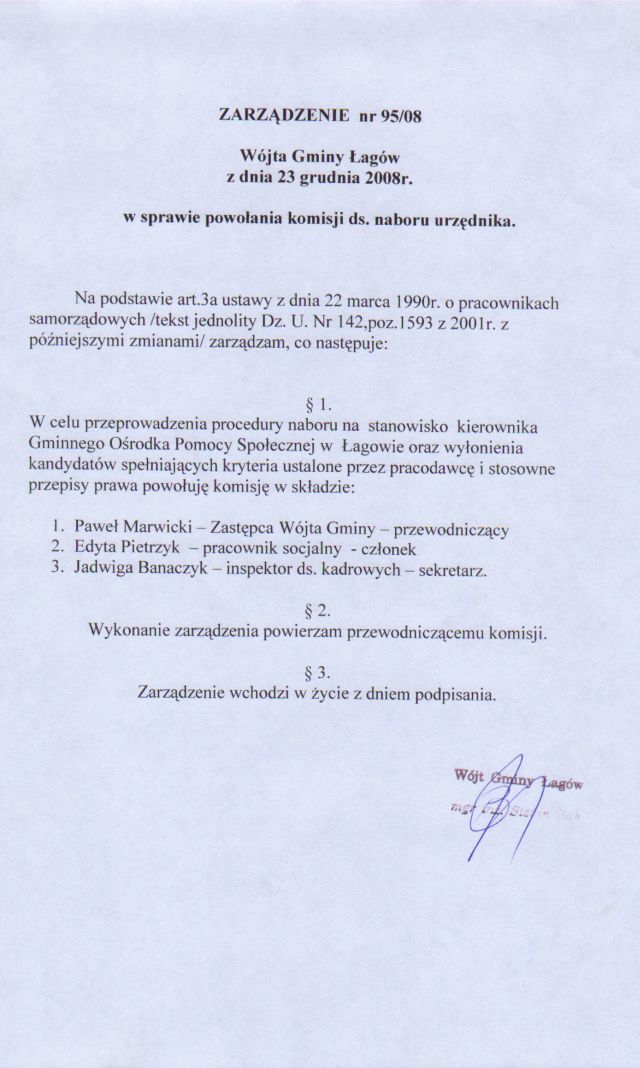 | Zarządzenie Nr 95/08 Wójta Gminy Łagów z dn. 10 grudnia 2008 r. w sprawie powołania komisji ds. naboru urzędnika. | 2009-02-03 |