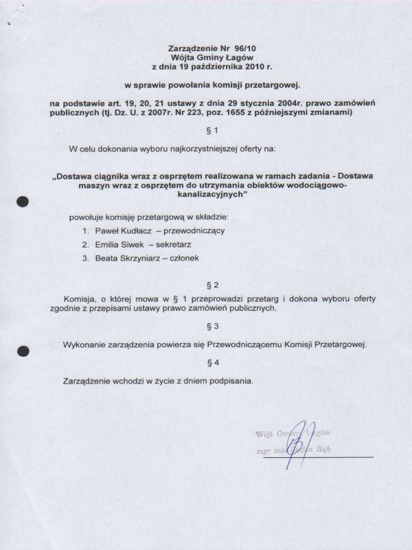 | Zarządzenie Nr 96/10 Wójta Gminy Łagów z dnia 09 października 2010 r. w sprawie powołania komisji przetargowej | 2011-01-04 |