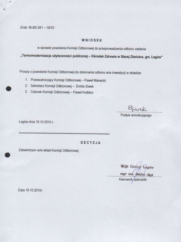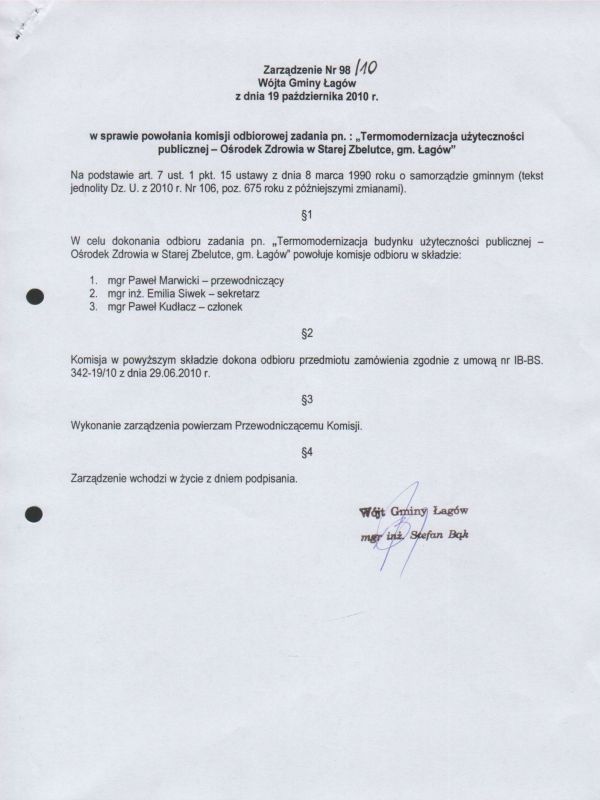 | Zarządzenie Nr 98/10 Wójta Gminy Łagów z dnia 19 października 2010 r. w sprawie powołania komisji odbiorowej zadania pn.:Termomodernizacja użyteczności publicznej - Ośrodek Zdrowia w Starej Zbelutce, gm.Łagów" | 2011-01-04 |