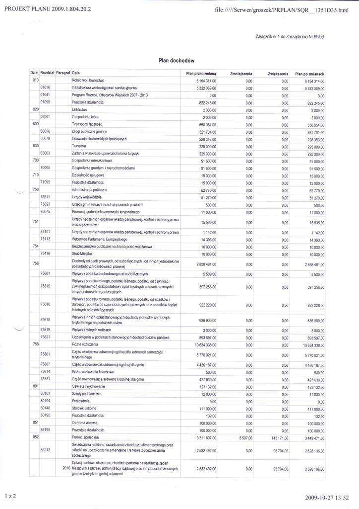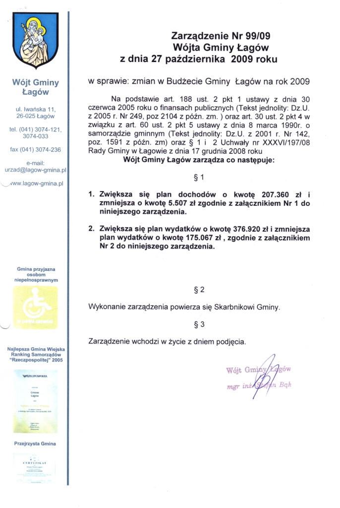 | Zarządzenie Nr 99/09 Wójta Gminy Łagów z dnia 27 października 2009r. w sprawie zmian w Budżecie Gminy Łagów na rok 2009. | 2009-11-19 |