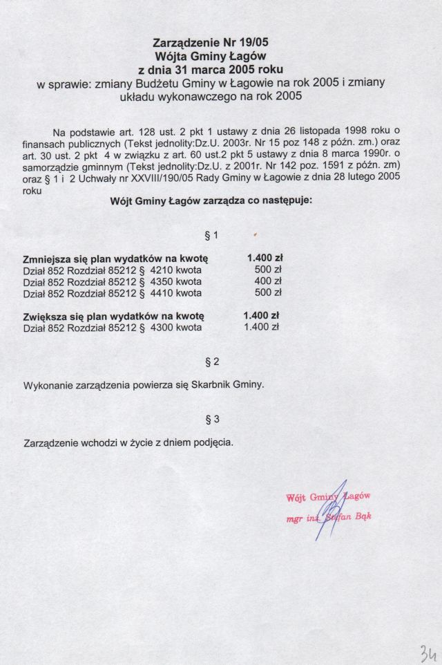 | Zarządznie nr 19/05 Wójta Gminy Łagów z dn. 31 marca 2005 r. w sprawie: zmiany Budżetu Gminy w Łagowie na rok 2005 i zmiany układu wykonawczego na rok 2005. | 2008-10-17 |