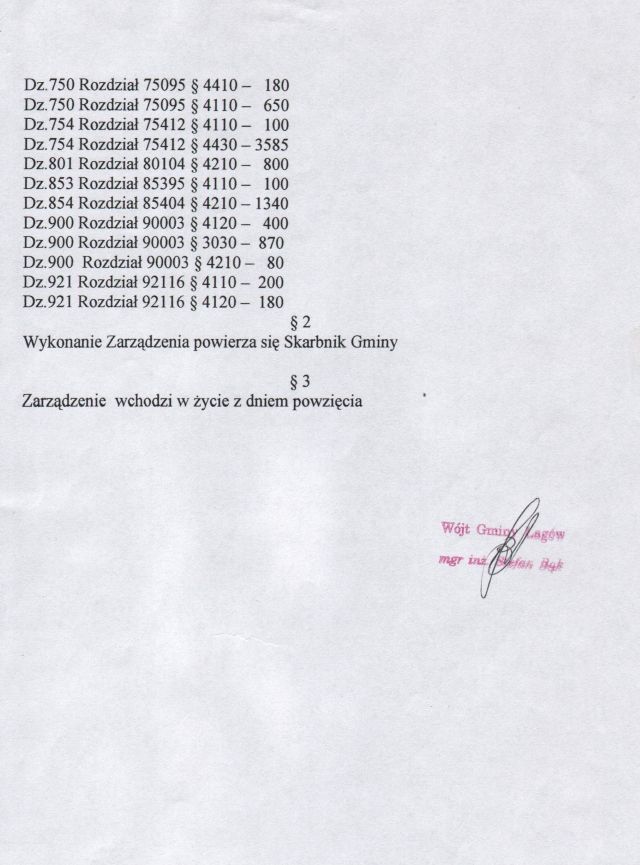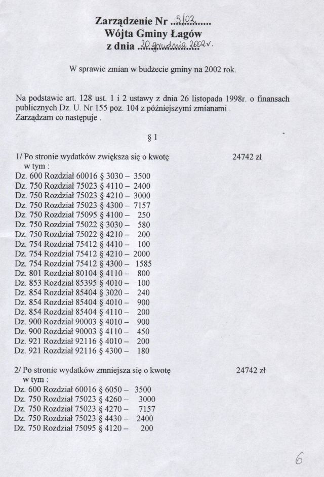 | Zarządznie nr 5/02 Wójta Gminy Łagów z dn. 20 grudnia 2002 r. w sprawie zmian w Budżecie Gminy Łagów na 2002 rok. | 2008-10-24 |