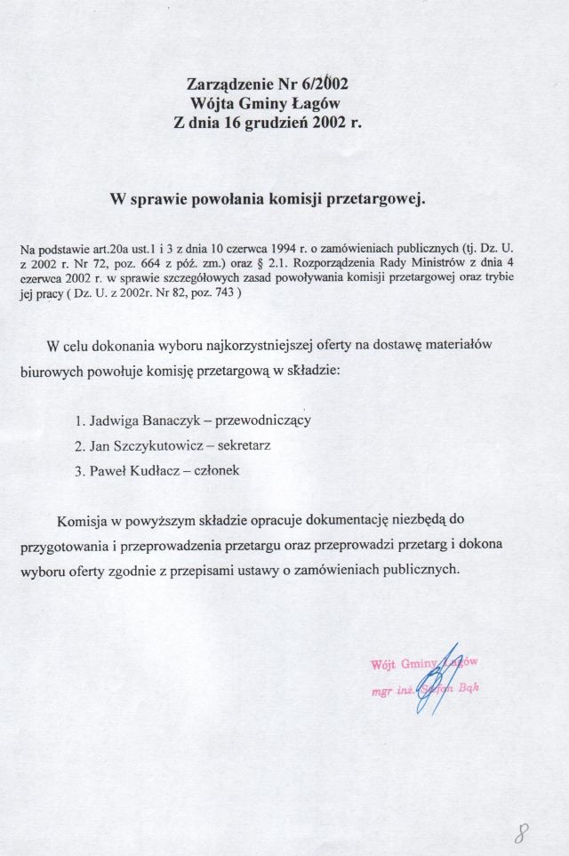 | Zarządznie nr 6/02 Wójta Gminy Łagów z dn. 16 grudnia 2002 r. w sprawie powołania komisji przetargowej. | 2008-10-24 |