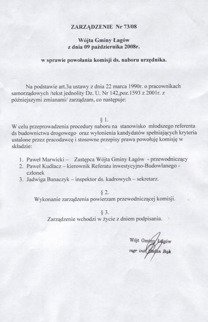 | Zarządznie nr 73/08 Wójta Gminy Łagów z dn. 9 października 2008 r. w sprawie powołania komisji ds. naboru urzędnika. | 2008-10-24 |