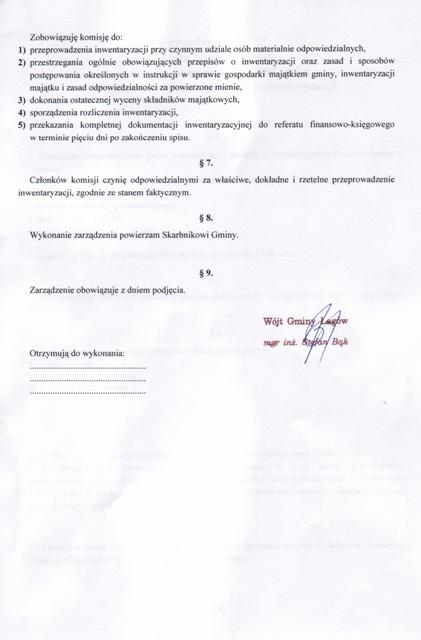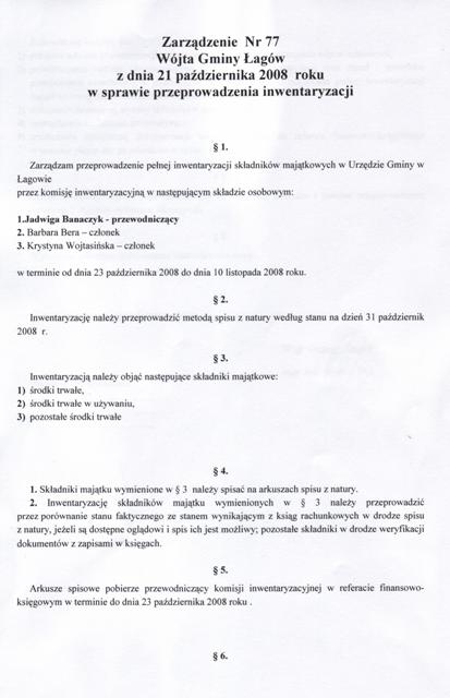 | Zarządznie nr 77/08 Wójta Gminy Łagów z dn. 21 października 2008 r. w sprawie przeprowadzenia inwentaryzacji. | 2008-12-04 |