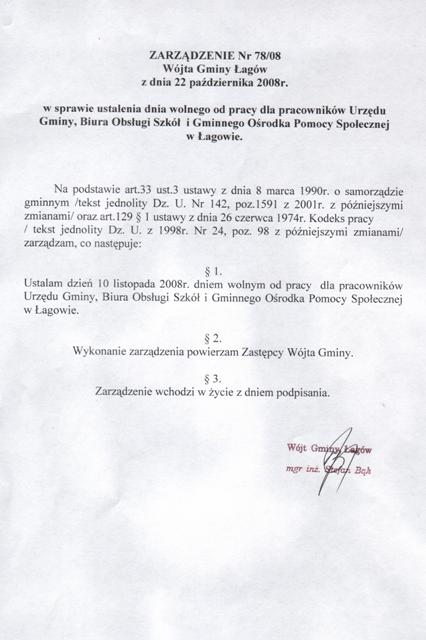| Zarządznie nr 78/08 Wójta Gminy Łagów z dn. 22 października 2008 r. w sprawie ustalenia dnia wolnego od pracy dla pracowników Urzędu Gminy, Biura Obsługi Szkół i Gminnego Ośrodka Pomocy Społecznej w Łagowie. | 2009-01-02 |