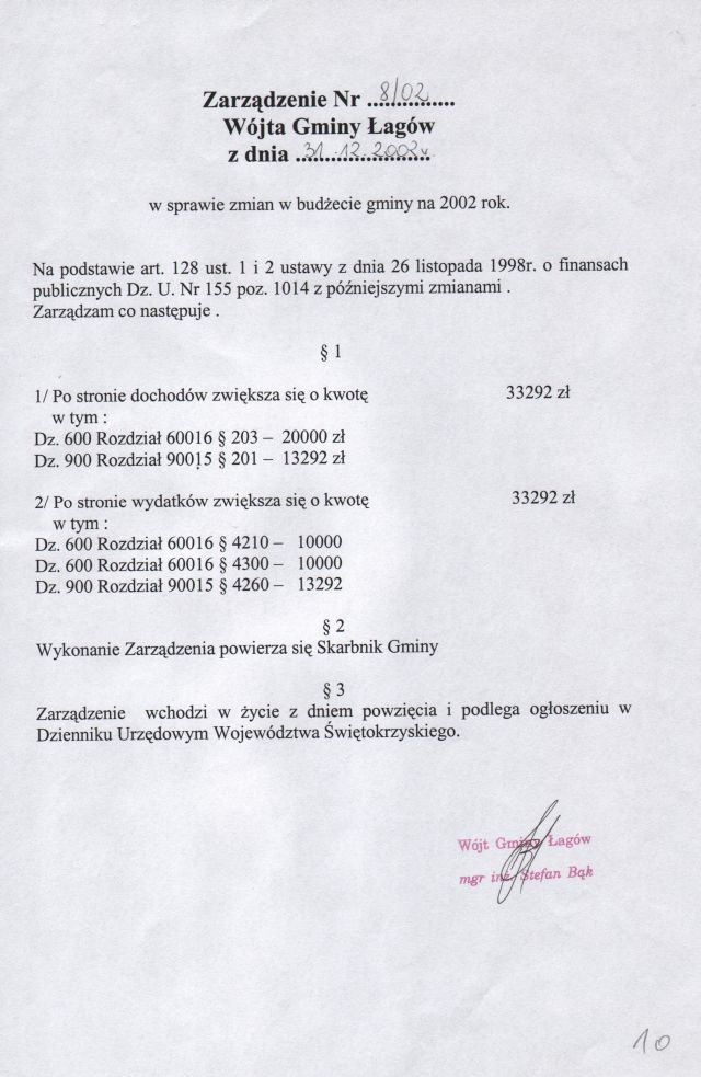 | Zarządznie nr 8/02 Wójta Gminy Łagów z dn. 31 grudnia 2002 r. w sprawie zmian w Budżecie Gminy Łagów na 2002 rok. | 2008-10-24 |
