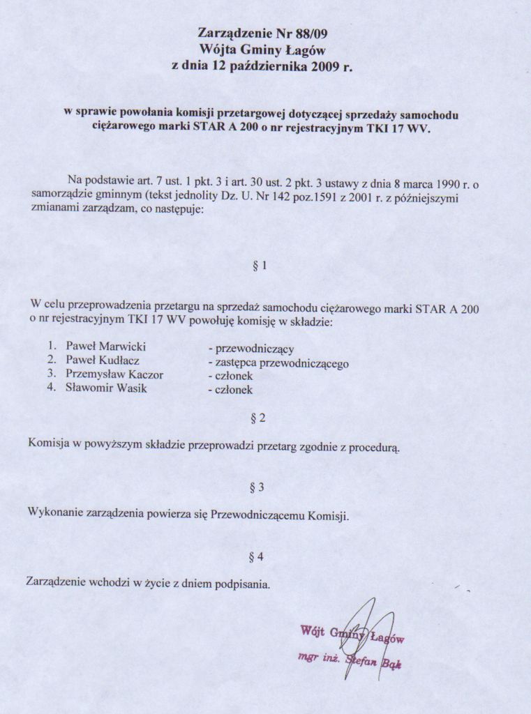 | Zarządznie nr 88/09 Wójta Gminy Łagów z dnia 12 października 209 r. w sprawie powołania komisji przetargowej dotyczącej sprzedaży samochodu marki STAR | 2009-11-10 |